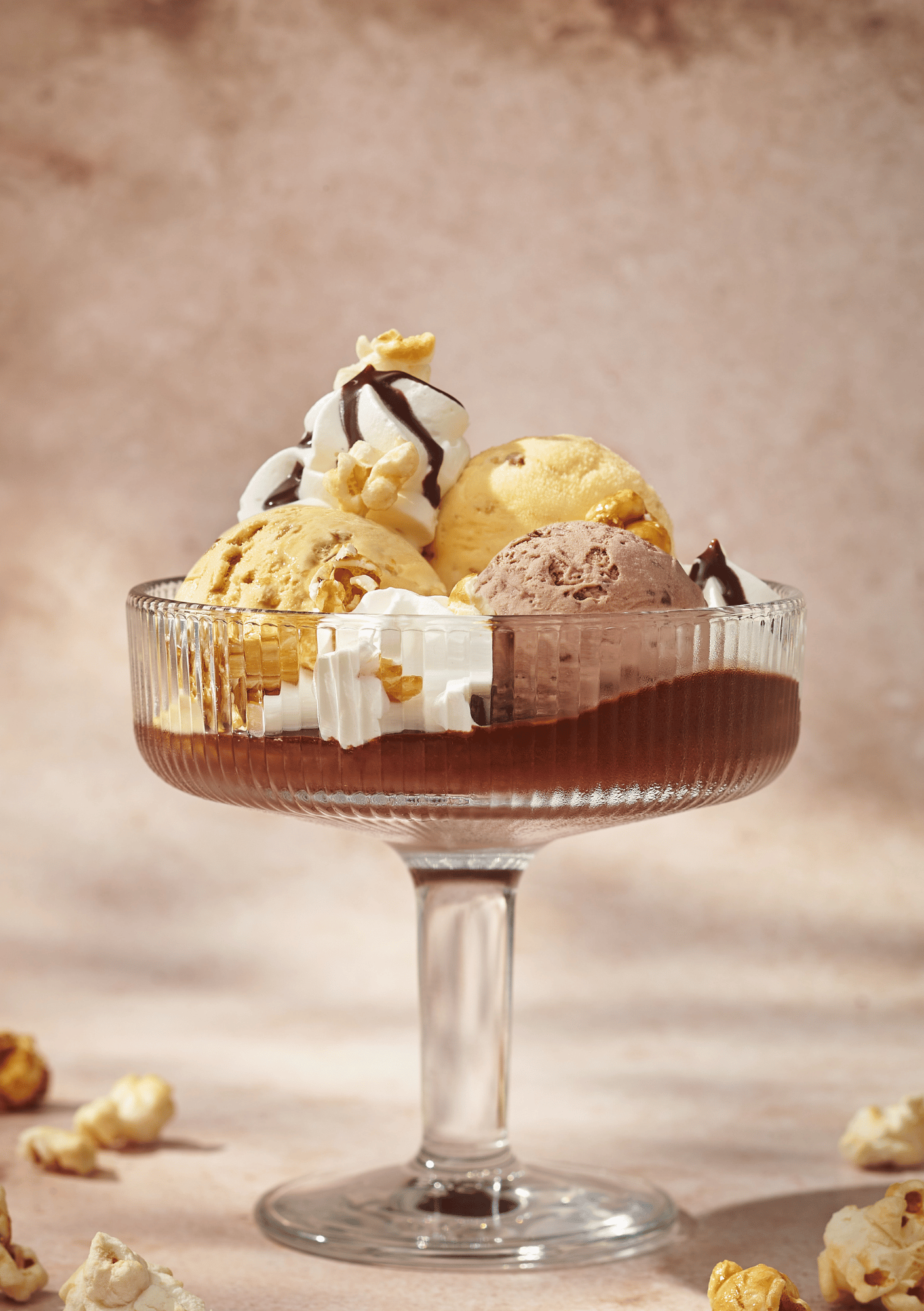 Ajoute les popcorns caramélisés au dernier moment pour qu’ils gardent tout leur croquant au contact de la glace !